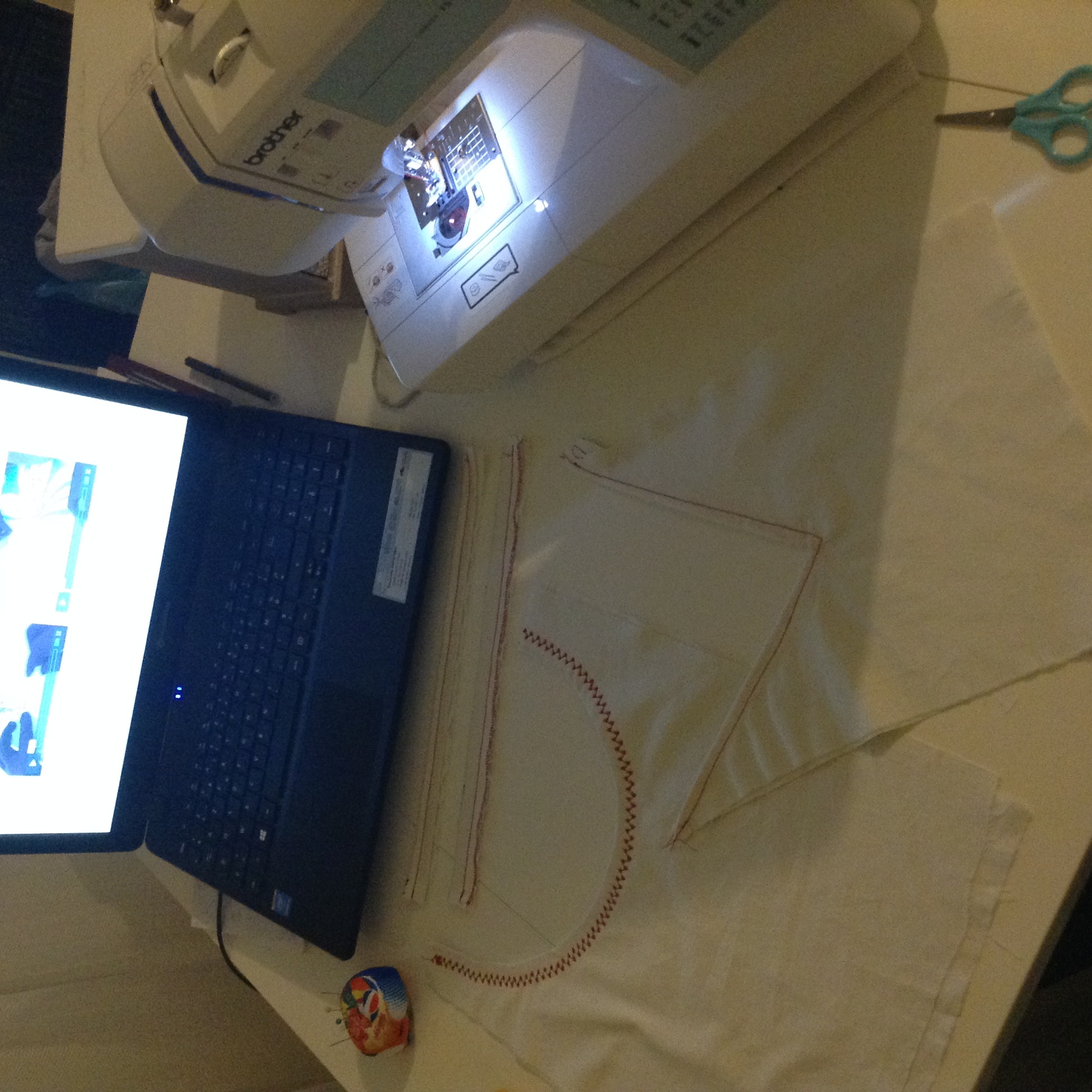Voici ce que j’ai pu réaliser aujourd’hui : ourlet simple et double ; assembler deux pièces courbes et en angle.