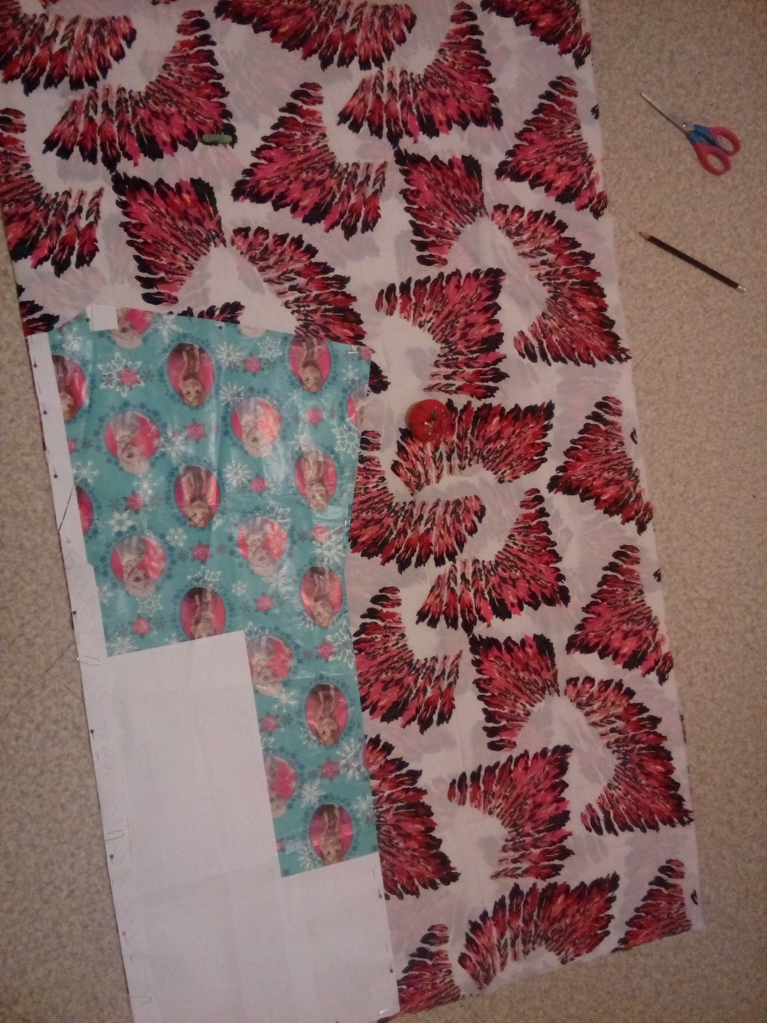 1. Je reporte mon patron(je lai fai sur le revers d’un papier cadeau et jai rajouté des feuilles A4 pour la longueur).j’avais du tissu a la maiison https://uploads.disquscdn.com/images/3cd994b6d7bd6bfa29bd31838ba97ad89e8d8e285352b3e468117b0e8b373e3c.jpg du coup j’ai pris celui ci mais il est très fin et très glissant.
